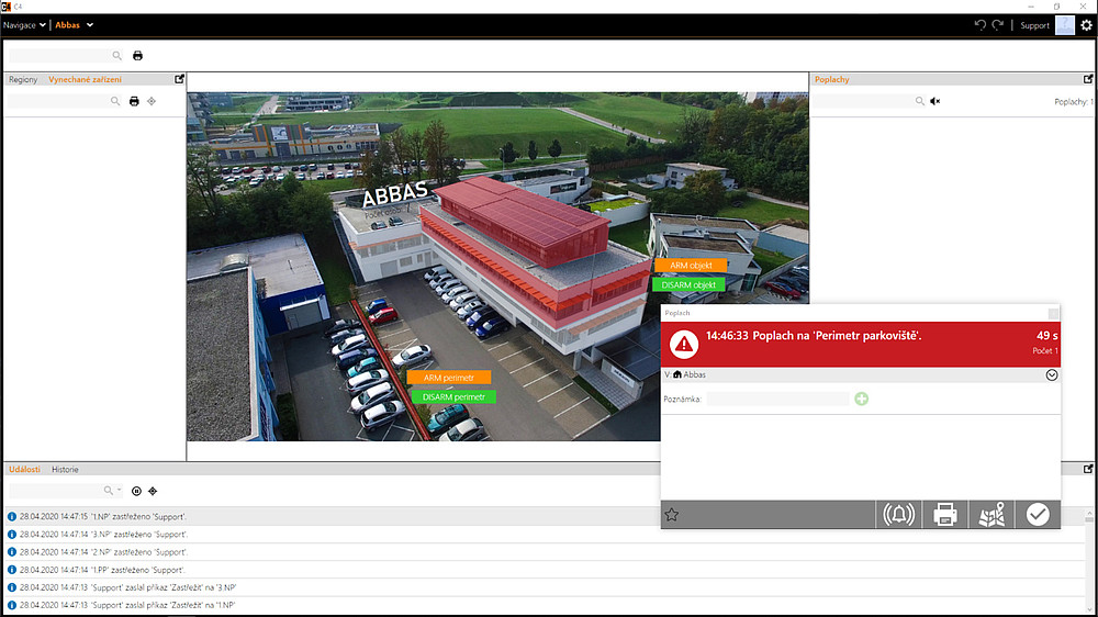 - Ovládání PZTS (ovládání podsystémů, potvrzení poplachů a poruch, přemostění vstupů, ovládání výstupů)